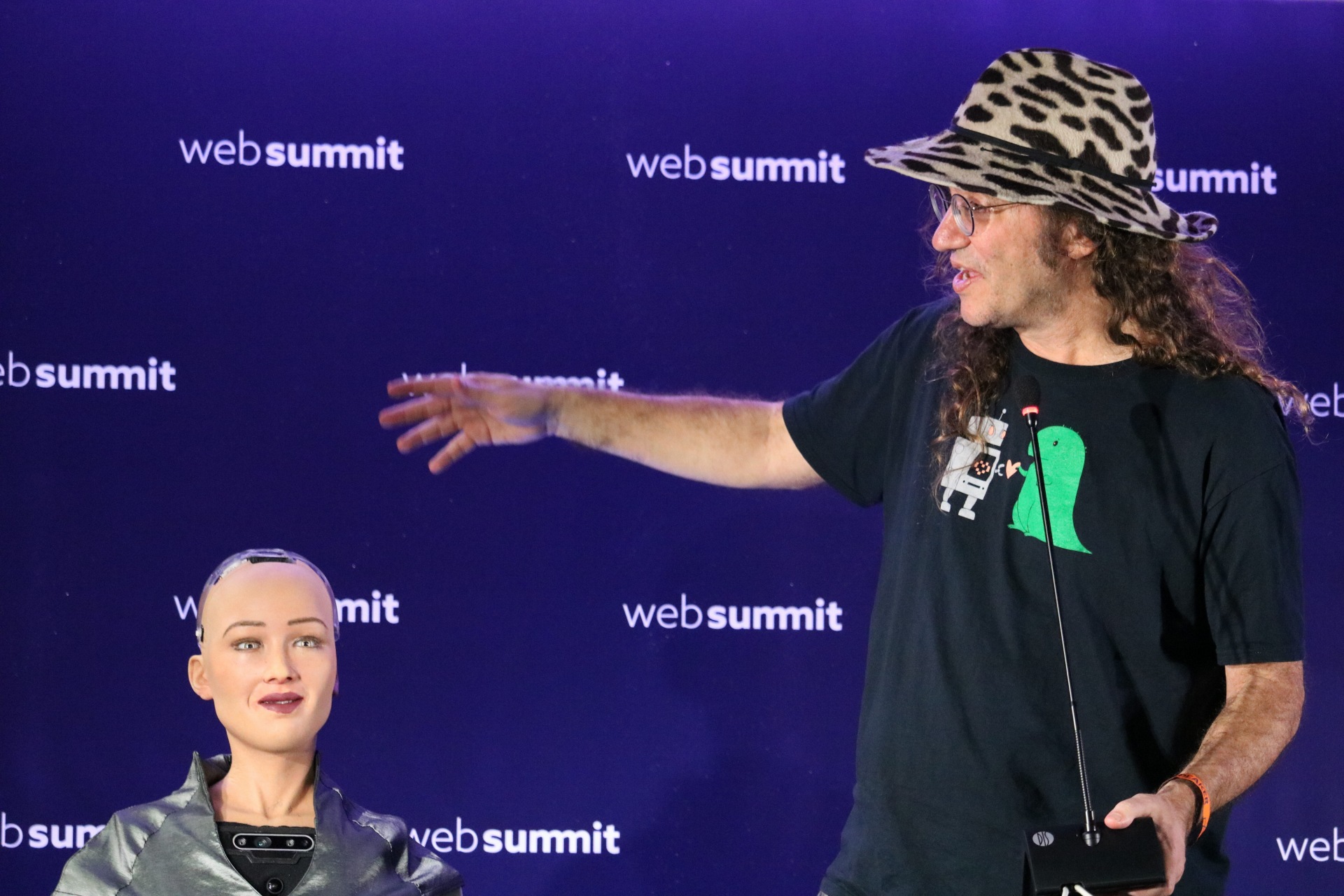 O criador e suas crias falaram ao público da Altice Arena sobre um tema básico: ‘quanto tempo falta para os robôs dominarem o mundo?’