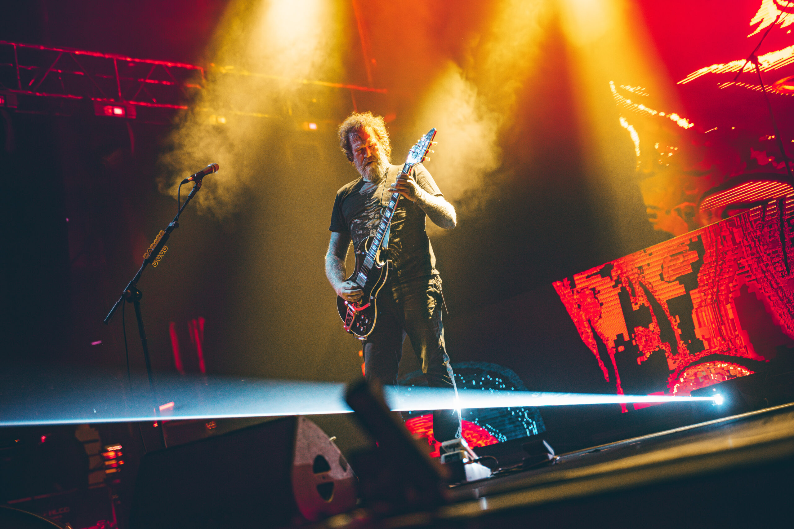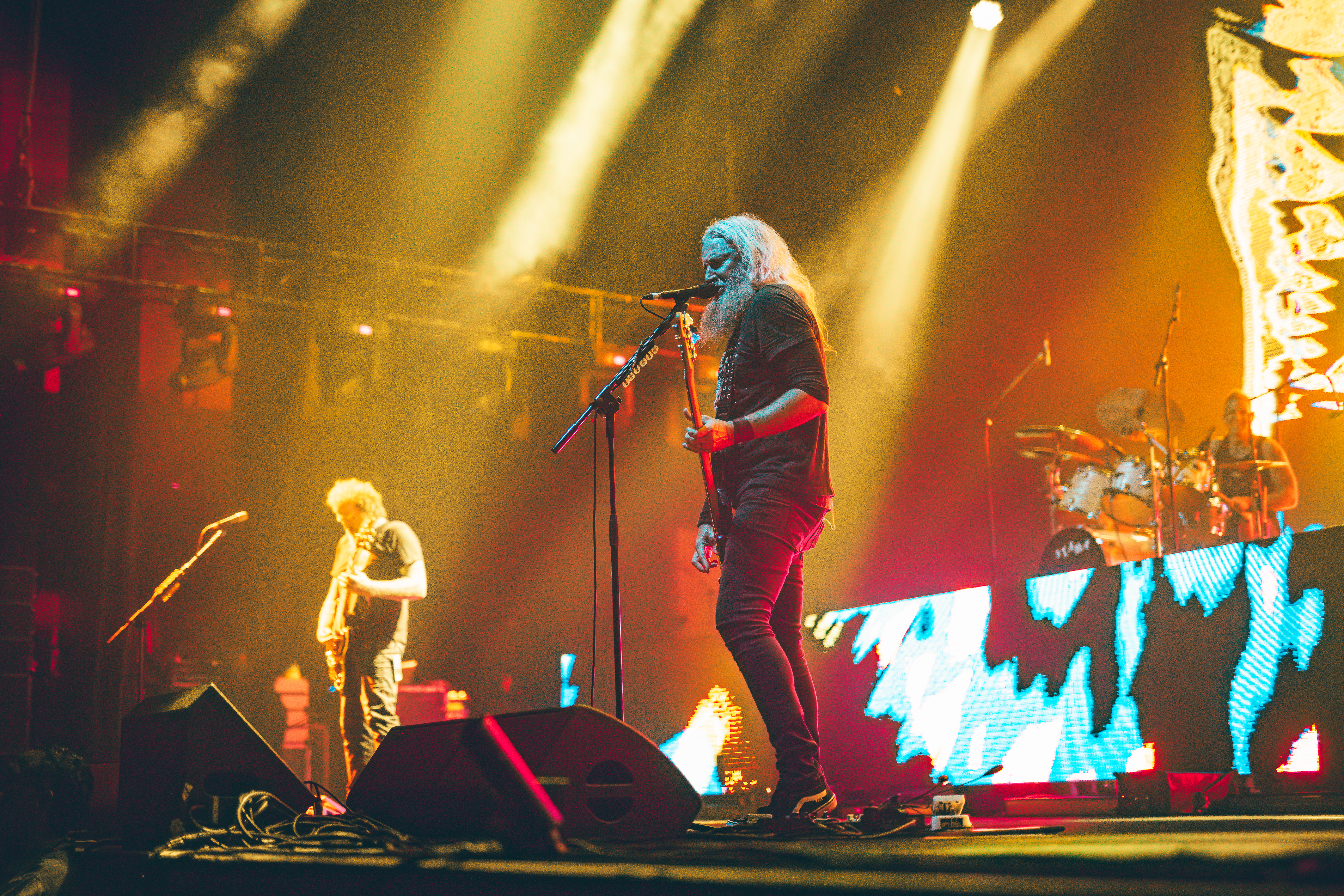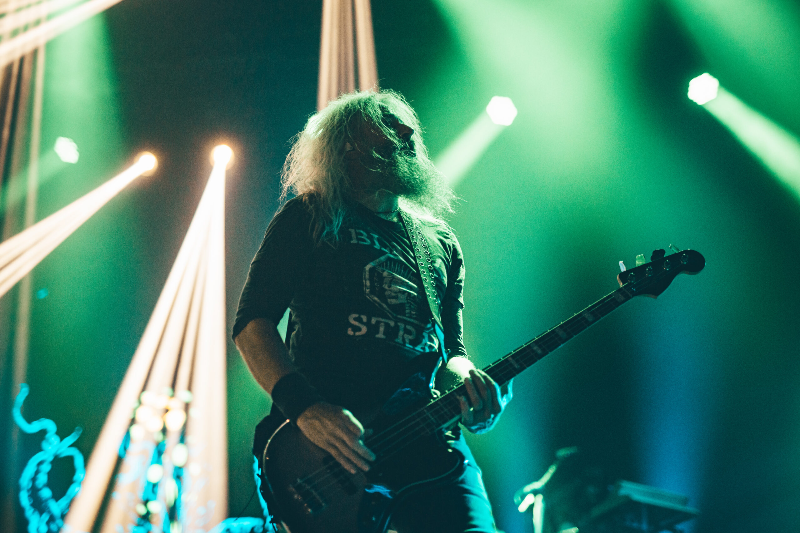 O Mastodon é reconhecido pelos videoclipes peculiares, muitas vezes integrando elementos de arte psicodélica. Ao vivo, essa estética única permanece presente. Enquanto as faixas eram executadas, um espetáculo visual à parte se desdobrava, com efeitos especiais que exibiam imagens sinistras, transformando o show em uma experiência tanto visual quanto sonora. Destacaram-se ‘Sultan’s Curse’, cujo cenário incorporou fortes referências à cultura mexicana e à tradicional festa do ‘Dia de Los Muertos’; ‘Halloween‘, com um incrível trabalho no estilo cartoon; e ‘Black Tongue‘, cujo cenário remetia aos antigos planos de fundo do Windows Media Player, evocando sentimentos nostálgicos especialmente entre os espectadores com idades entre 30 e 40 anos, que provavelmente descobriram o trabalho da banda por meio de downloads em softwares P2P durante meados da década de 2000.