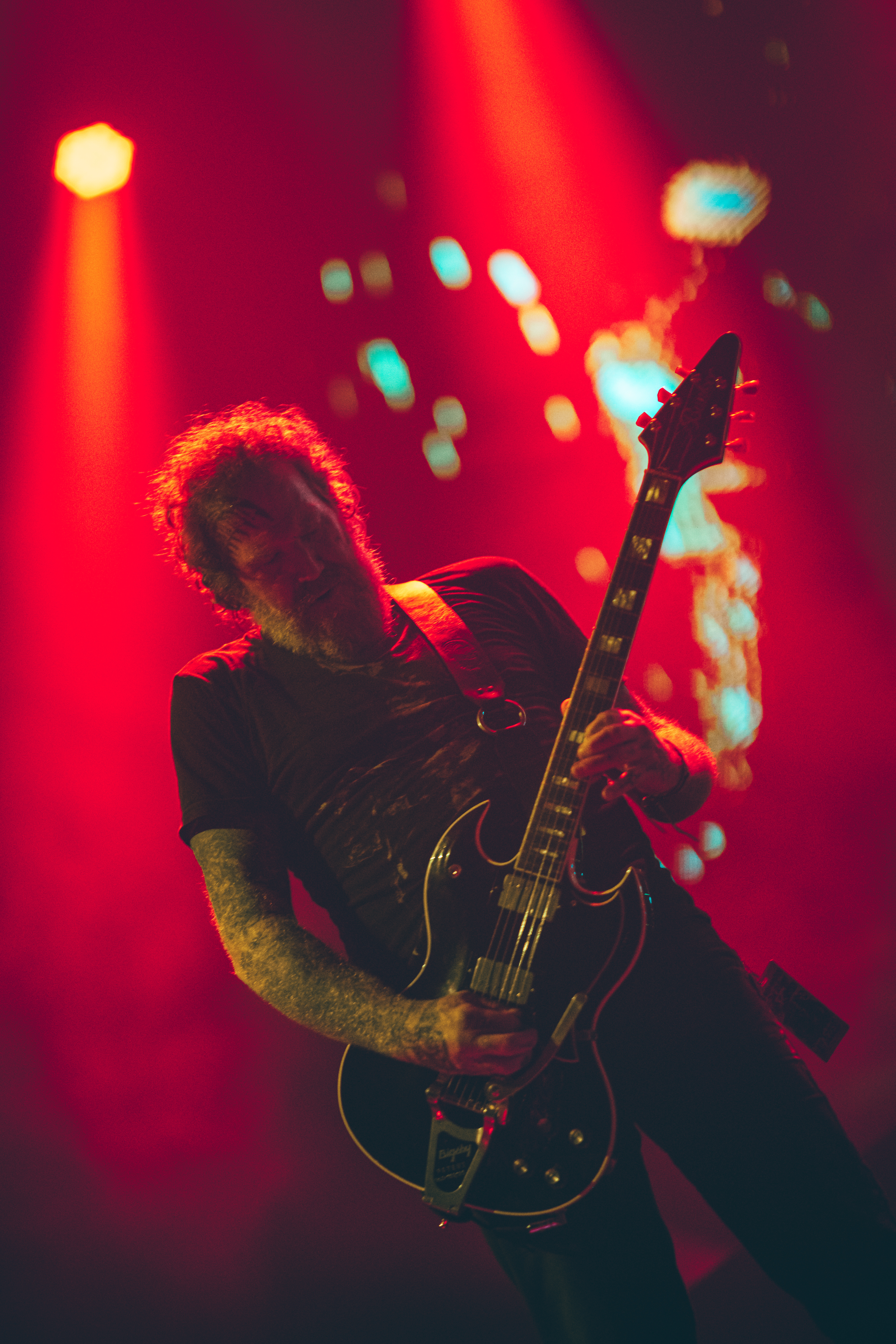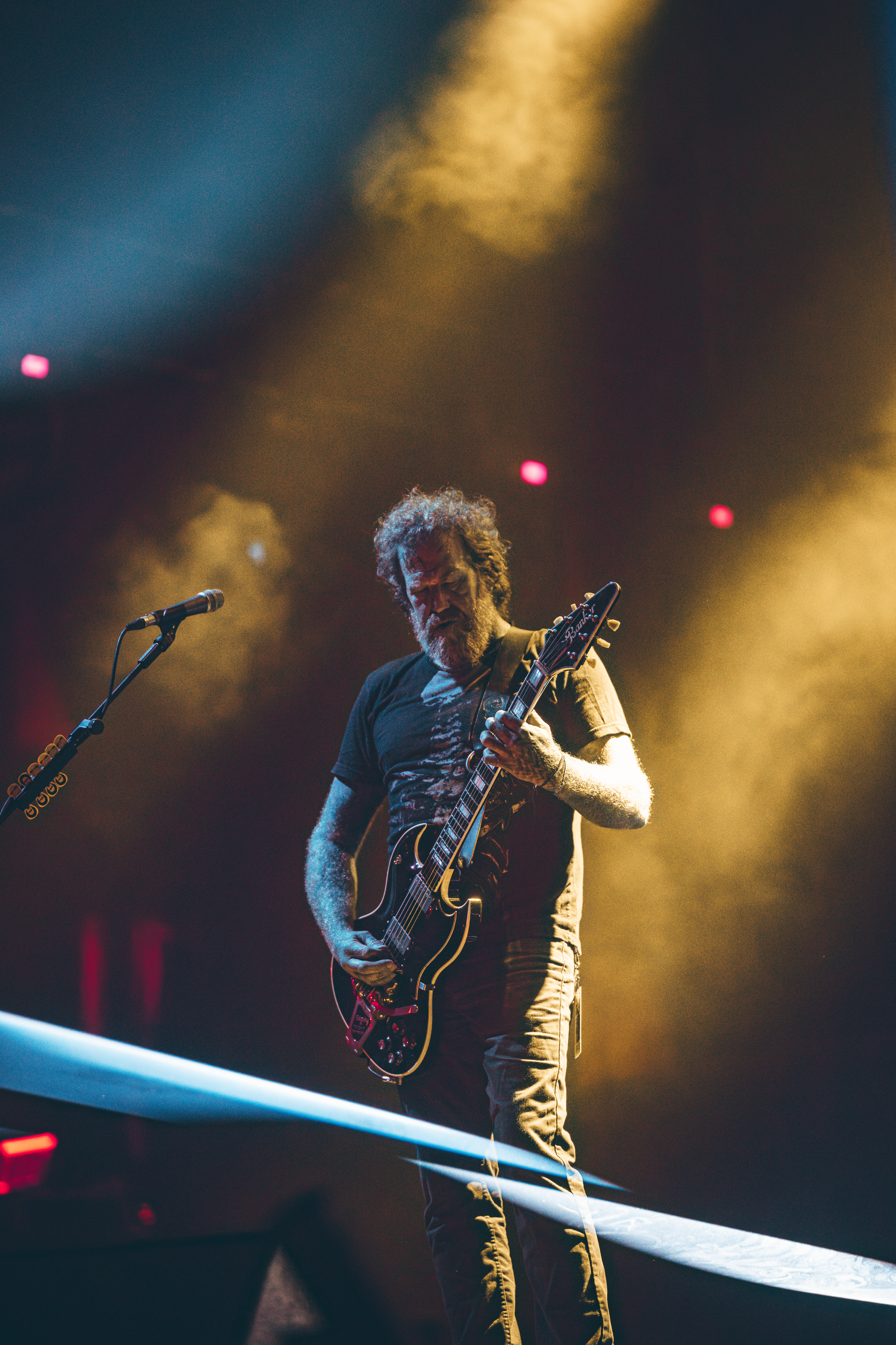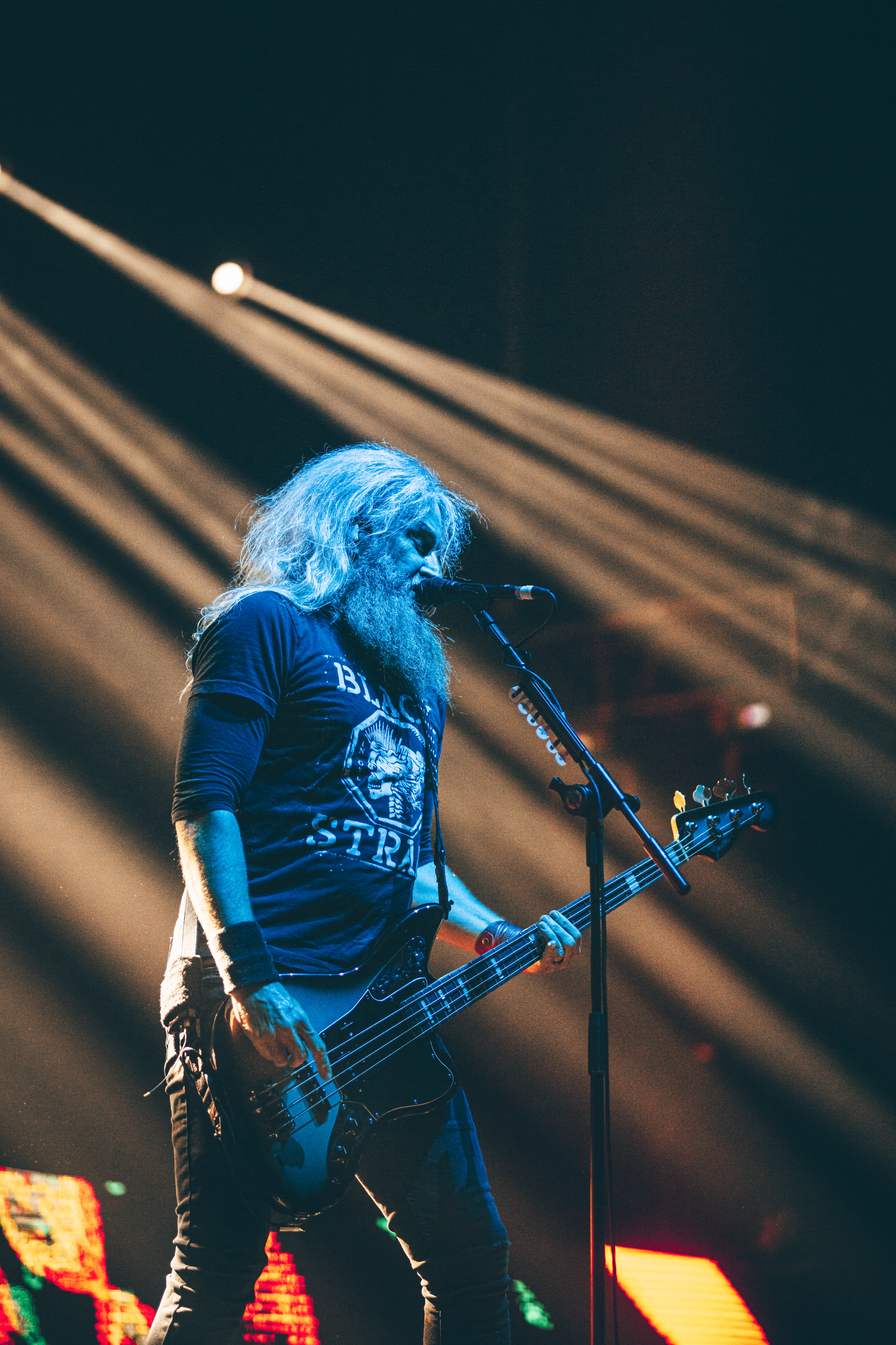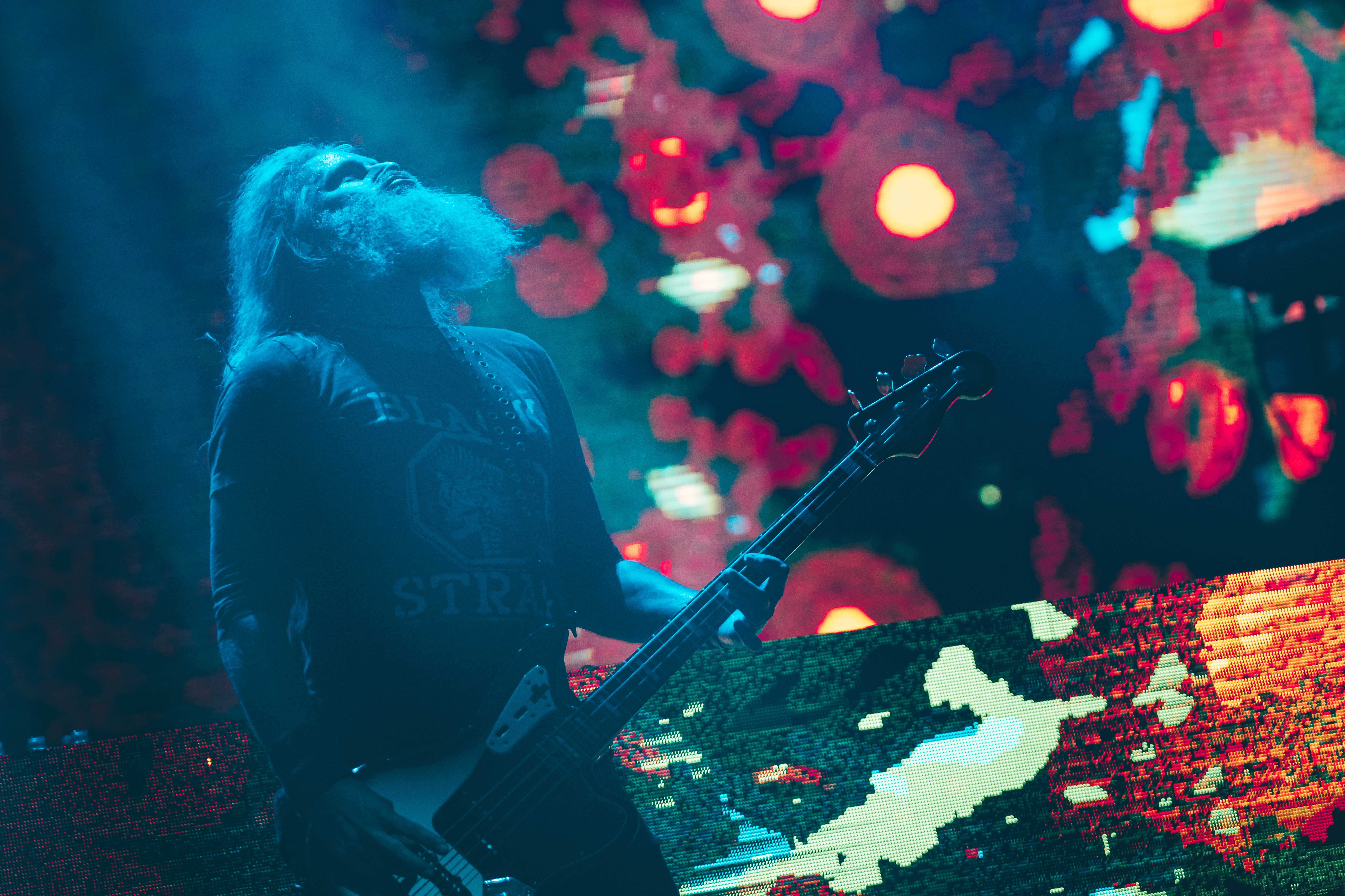 O Mastodon é reconhecido pelos videoclipes peculiares, muitas vezes integrando elementos de arte psicodélica. Ao vivo, essa estética única permanece presente. Enquanto as faixas eram executadas, um espetáculo visual à parte se desdobrava, com efeitos especiais que exibiam imagens sinistras, transformando o show em uma experiência tanto visual quanto sonora. Destacaram-se ‘Sultan’s Curse’, cujo cenário incorporou fortes referências à cultura mexicana e à tradicional festa do ‘Dia de Los Muertos’; ‘Halloween‘, com um incrível trabalho no estilo cartoon; e ‘Black Tongue‘, cujo cenário remetia aos antigos planos de fundo do Windows Media Player, evocando sentimentos nostálgicos especialmente entre os espectadores com idades entre 30 e 40 anos, que provavelmente descobriram o trabalho da banda por meio de downloads em softwares P2P durante meados da década de 2000.