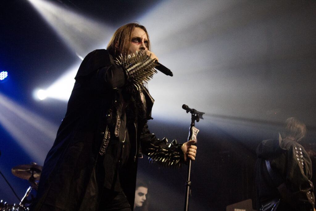 Com a casa completamente lotada, o Cradle of Filth subiu ao palco às 19h20 — vinte minutos após o horário programado. Diferentemente da atmosfera sombria e minimalista do Uada, Dani Filth e companhia entraram em cena com impacto, apostando em explosões de fumaça e iluminação colorida. A abertura ficou por conta de ‘To Live Deliciously’, faixa do novo álbum, marcada por arpejos elaborados, um solo bem construído e bateria avassaladora — prova de que a banda continua entregando um som brutal e afiado. Logo em seguida, o grupo voltou no tempo para 1992 com ‘The Forest Whispers My Name’, do disco ‘The Principle of Evil Made Flesh’, em uma performance que soou como puro black metal extremo, sustentada por skank beats furiosos, gritos dilacerantes de Dani e viradas complexas de bateria. Nesse momento, os guitarristas também aproveitaram para interagir com a plateia.