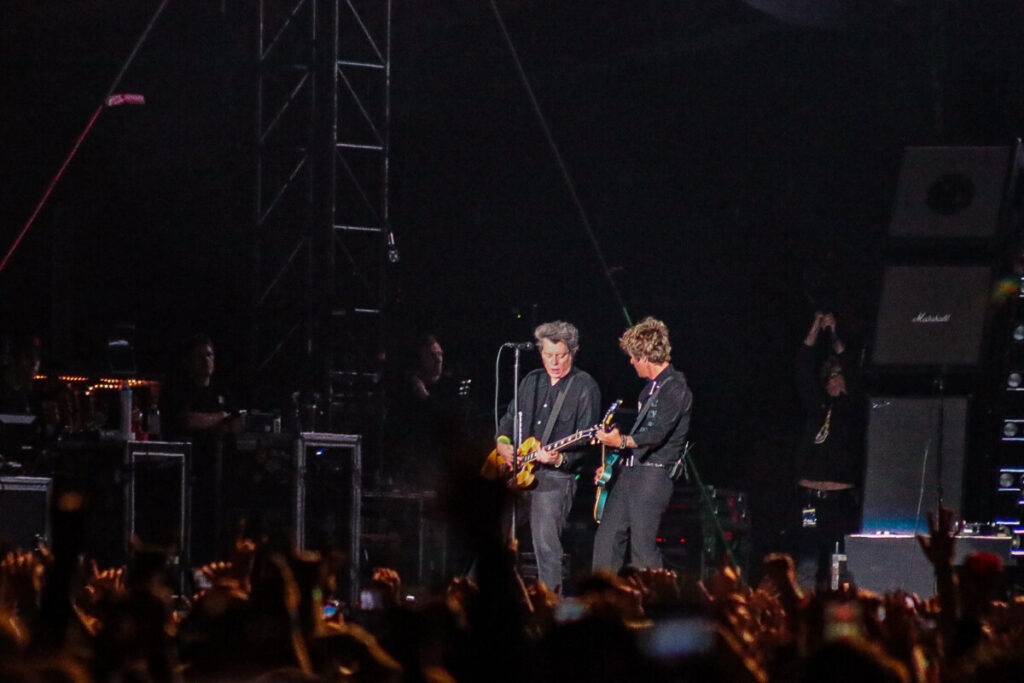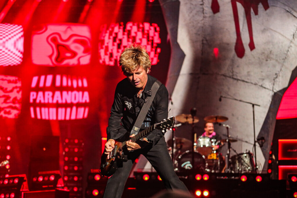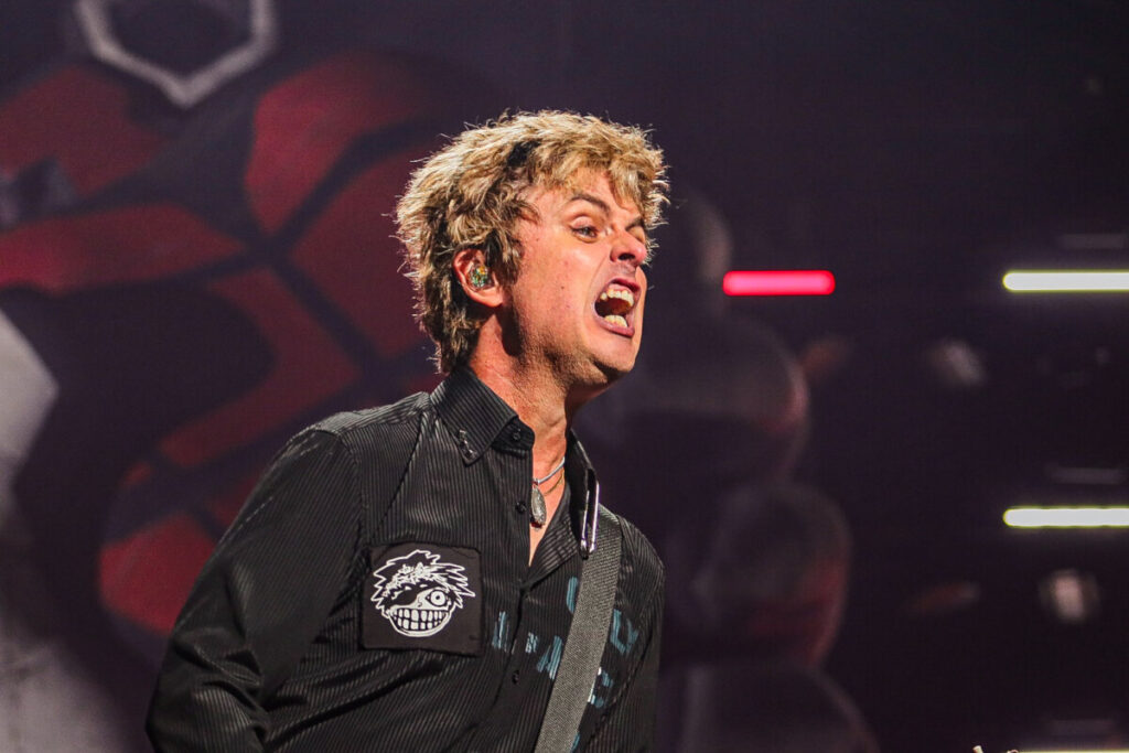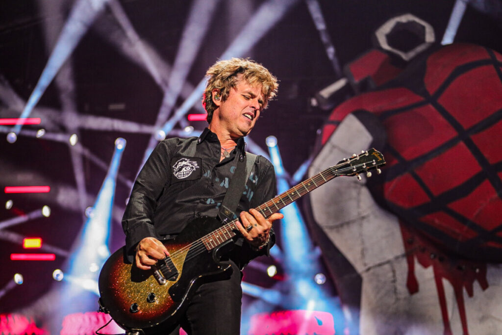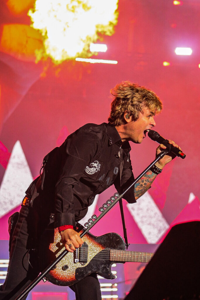 Sem demora, a banda abriu o show com a faixa-título de American Idiot (2004), levando o público ao delírio. A canção veio com uma atualização na letra — ‘Well, maybe I’m the faggot, America // I’m not a part of a MAGA agenda‘ — em crítica à atual gestão de Donald Trump. Na sequência, ‘Holiday’, outro grande hit do álbum, incendiou o palco com labaredas e efeitos pirotécnicos. Em ‘Know Your Enemy’, Billie convidou uma fã ao palco para dividir os vocais no refrão, arrancando aplausos e gritos da multidão. Já a balada ‘Boulevard of Broken Dreams’, transformou a Arena da Baixada em um verdadeiro mar de luzes de celulares — um dos momentos mais belos e marcantes da noite.