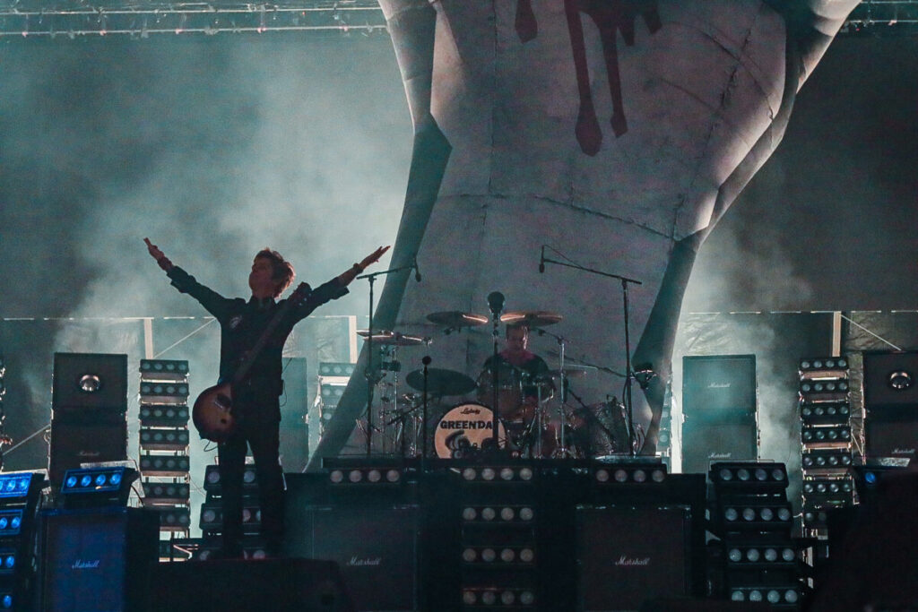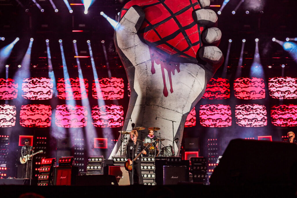 Em seguida, as luzes se apagaram. A Marcha Imperial, de Star Wars, começou a tocar enquanto imagens que recontavam a trajetória do trio californiano eram exibidas nos telões do estádio. Ao fundo, um imenso balão com a icônica capa de American Idiot tomou forma, preparando o terreno para a entrada triunfal de Billie Joe Armstrong (vocal e guitarra), Tré Cool (bateria) e Mike Dirnt (baixo).