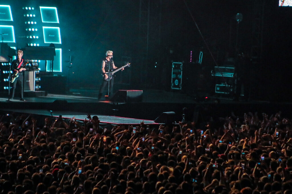 Logo após, o balão com a capa do disco foi retirado do cenário, e o Green Day iniciou uma sequência de faixas secundárias, incluindo ‘One Eyed Bastard’ (presente em ‘Saviours’), ‘Revolution Radio’ (faixa-título do disco de 2017) e ‘Church on Sunday’, de ‘Warning’, uma raridade tocada ao vivo pouquíssimas vezes. Depois dessa sessão de canções menos populares, o público foi transportado aos anos 1990 com clássicos como ‘Longview’, ‘Welcome to Paradise’ e ‘Hitchin’ a Ride’, que fizeram a plateia formar moshpits e acender sinalizadores — logo controlados pela segurança do estádio. Hits mais enérgicos, com ritmo acelerado de punk rock, como ‘Brain Stew’, ‘St. Jimmy ‘ e ‘Dilemma’, mantiveram a animação no alto.
